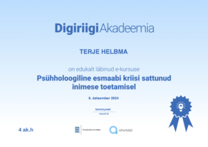 - “Psühholoogilise esmaabi kriisi sattunud inimese toetamisel” kursus. Ohvriabi